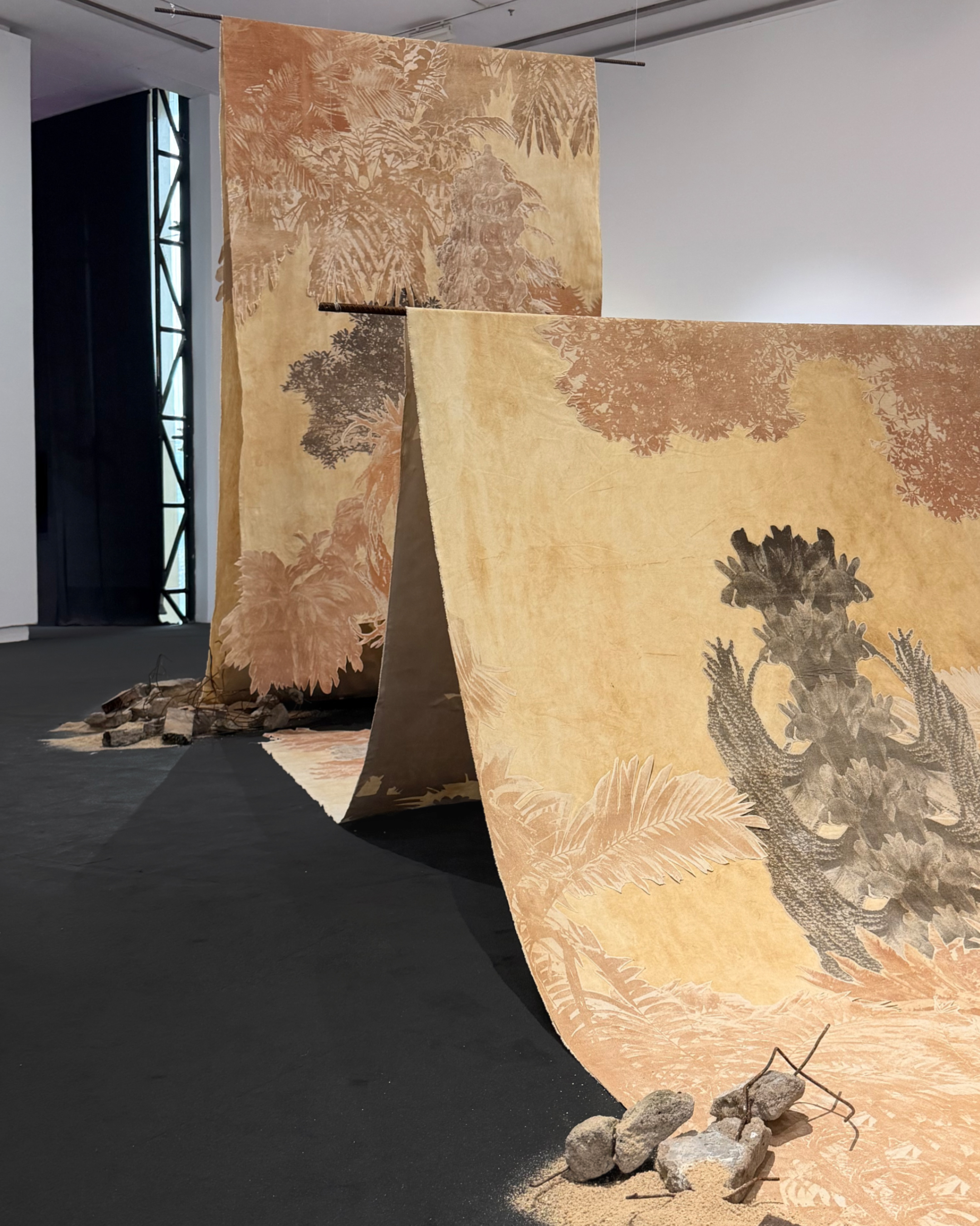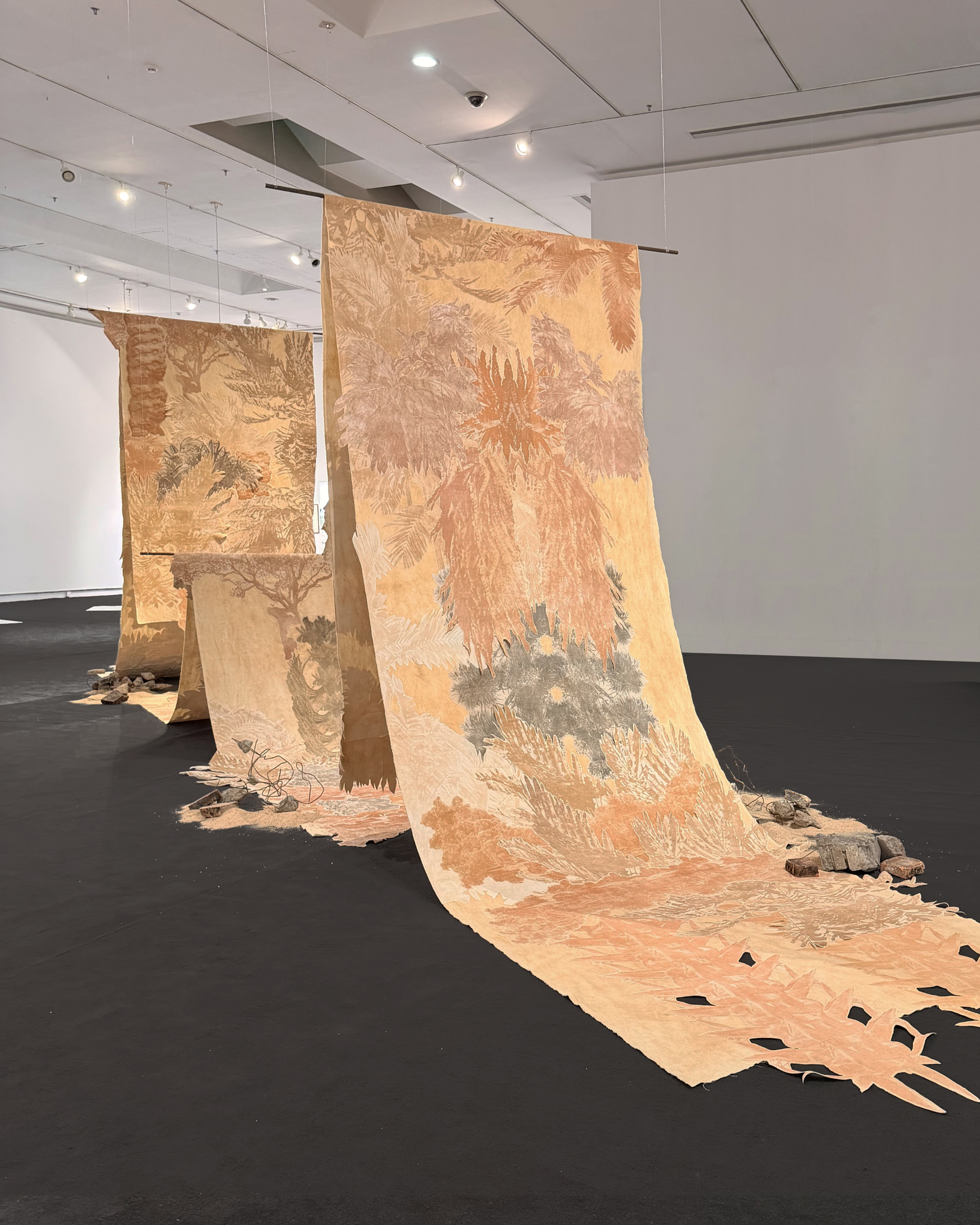 I wanted to reflect on how contemporary economic systems can rapidly reshape shared environments. This work takes roots in traditional Balinese landscape painting, but using photographs of forest environments, taken during my latest treks in the northern area, as the main subject to be handprinted on textile.