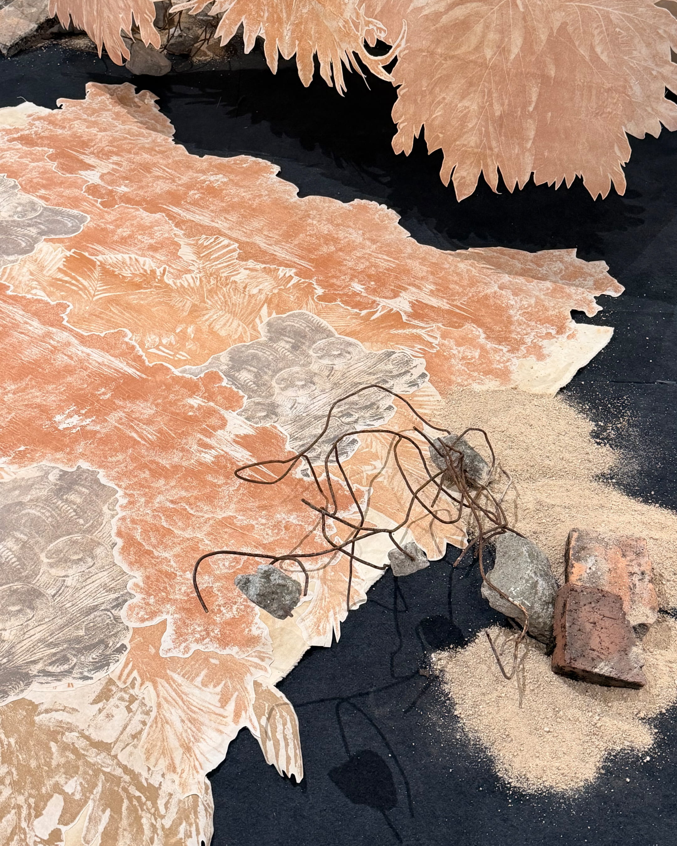 The pigments used were processed entirely from construction debris: crushed brick, ground concrete, powdered rust, and fragments of broken pavement. Materials foraged directly from the streets of the overdeveloped south, where waste accumulates everywhere.